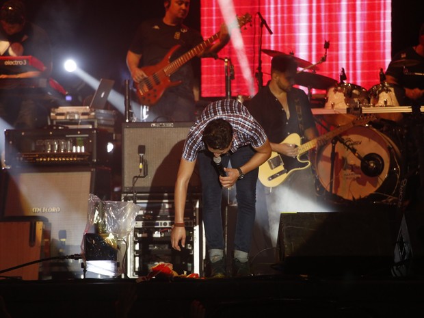 Israel Novaes recolhe o sutiã atirando no palco
